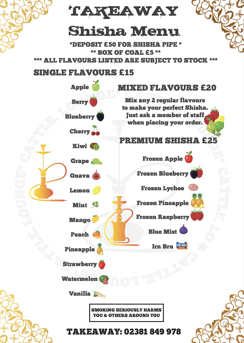 A range of Shisha Flavours & Cocktails to choose from, please see website.